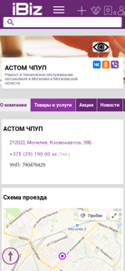 | AI-анализ | --- The web project 'АСТОМ ЧПУП' is a company offering car repair and technical servicing in Mogilev and Mogilev region. The address is given as 212022, Mogilev, Космонавтов, 39Б. The contact phone number is available as '+375 (29) 190 00 xx'. The business provides its services from Monday to Saturday, with no lunch breaks. The company is listed under the category 'Станции технического обслуживания' in Yandex Business Directory. The domain name is 'actom.ibiz.by'. |