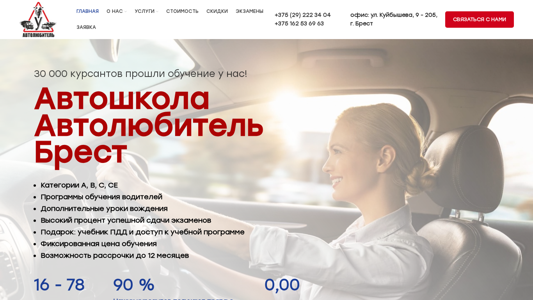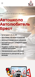 | AI-анализ | --- The web project "Autoshkola Autolubitel Brest – Category A, B, C, CE" is a website for a driving school in Brest, Belarus. The title of the website reflects the offered driving courses for different categories: A, B, C, and CE. The description mentions that there are programs for driver education, including additional driving lessons and the possibility of transferring certifications from one category to another. The school offers taxi services and international passenger and cargo transportation. The costs, discounts, and exam information are provided, along with contact details and office location. The website claims to have taught driving to 30,000 students. The classes are offered at three locations, providing modern and comfortable learning environments. Practical driving lessons are conducted on Renault Logan vehicles and at a driving range near the Traffic Police Office. The website offers flexible scheduling for different groups, including |