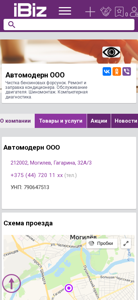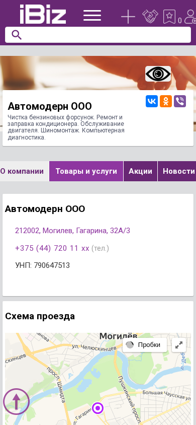 | Название / Заголовок | Автомодерн ООО - Чистка бензиновых форсунок. Ремонт и заправка кондиционера. Обслуживание двигателя. Шиномонтаж. Компьютерная диагностика. . 212002, Могилев, , Гагарина, 32А/3 |