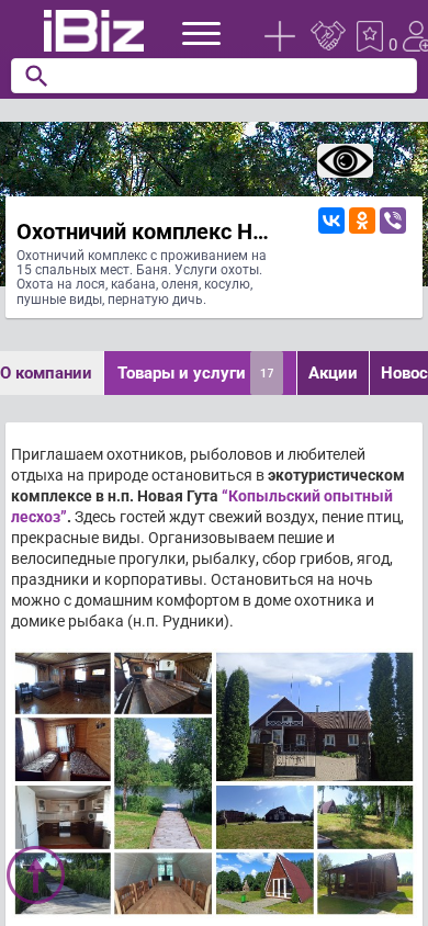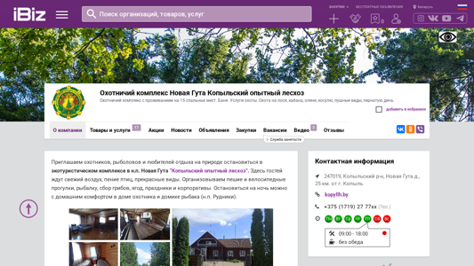 | AI-анализ | The website is for an hunting complex named "Новая Гута Копыльский опытный лесхоз" (New Guta Copil Experimental Forestry) located in the village of New Guta, 25 kilometers from the city of Copil in Belarus. The website promotes an hunting complex that offers accommodation for 15 guests, a sauna, and hunting services. Hunting options include moose, boar, deer, rabbit, fur animals, and bird species. The website also mentions organized fishing, hiking, and bicycle tours, as well as events and corporate gatherings. The complex includes a two-story house with three rooms, a common area with seating for 15 people, showers, and a toilet. There is also a separate house for fishermen, equipped with a kitchen, dining room, barbecue area, sauna, |