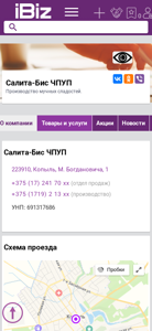 | AI-анализ | The web project Salita-Bis CPUP is a manufacturing company specializing in the production of baked confectionery goods. The company's address is listed as 223910, Kopyl, M. Bogdanovicha, 1. The website provides contact information for sales and production, with phone numbers +375 (17) 241 70 xx and +375 (1719) 2 13 xx respectively. The company's UNP number is 691317686. The website offers information on products and services, including confectionery items and potential acquisitions. It also features company news, job listings, videos, and customer reviews on various social media platforms. The company's operating hours are listed as Monday through Friday, from 9:00 AM to 6: |