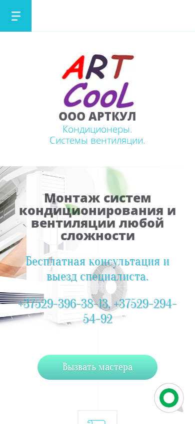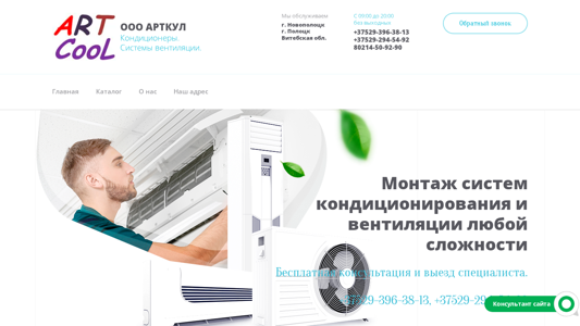 | AI-анализ | The website is for OOO ArtKul, a company based in Novopolotsk, Belarus, specializing in the supply and installation of ventilation systems and air conditioners. The company prioritizes comfort, safety, reliability, ergonomics, and efficiency in its offerings. The site provides information on various services, including installation, demounting, and maintenance of the systems. Users can contact the company via two phone numbers or by requesting a callback. The main menu includes sections for the homepage, catalog, about us, and contact information. The company offers a full range of services for the installation, demounting, and maintenance of various types of air conditioning and ventilation systems, with guarantees on all work. Prices for maintenance and installation are listed, along with examples of completed projects. Products for sale include various air conditioners, with prices including installation and materials. The site is available |