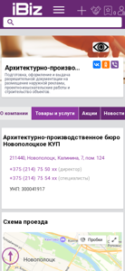| AI-анализ | The portal Archiтеcturalno-производstvennoe bюro Novopolotckoe KUP is a business based in Novopolotsk, Belarus, offering services related to the preparation, formalization, and issuance of permits for outdoor advertising, project-engineering works, and construction projects. The company's address is listed as Kalinina 7, office 124. The contact numbers provided are +375 (214) 75 50 xx for the director and +375 (214) 75 54 xx for specialists. The company's Unified State Register number is 300041917. The portal includes a map for visitors to find the location, business hours from Monday to Saturday without lunch breaks, and a section for user reviews and ratings. The website |