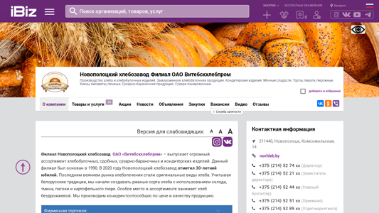 | AI-анализ | This website is a branch of Novopolotsk Bread Factory OAO Vitsebskhlebprom, specializing in the production of bread and baked goods, including frozen bakery products, confectionery items, sweet baked goods, cakes, pies, pastries, cookies, biscuits, and sugary candies. The branch is located in Novopolotsk, Belarus, at Komsomoskaya Street 14. |