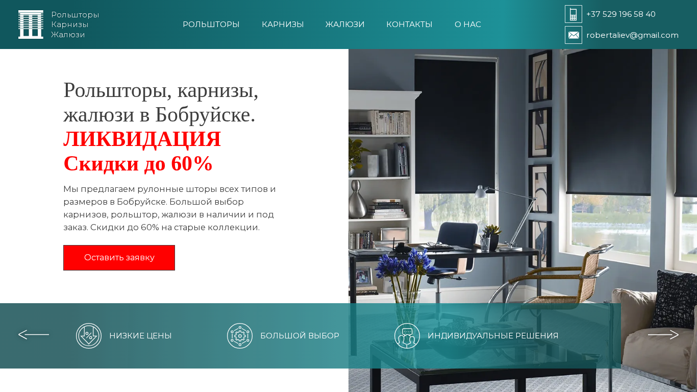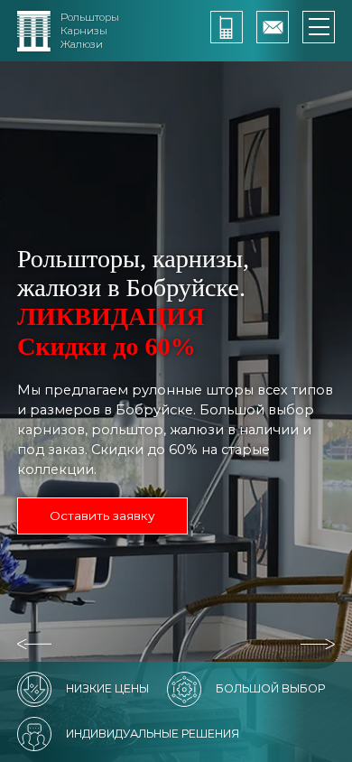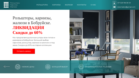 | SEO-описание | Мы предлагаем рулонные шторы всех типов и размеров в Бобруйске. Большой выбор карнизов, рольштор, жалюзи в наличии и под заказ. Скидки до 60% на старые коллекции. |