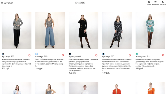 | AI-анализ | The web project N-SOLO is an online catalog featuring various clothing items for women. The title of the website is "N-SOLO". Some of the top keywords associated with the site include "модель" (model), "артикул" (article), "фото" (photo), "ростом" (height), "176" (a specific height), "размер" (size), "руб" (Russian currency), "спереди" (in front), "длинным" (long), "рукавом" (sleeve), "заст" (fastening), "без" (without), "силуэта" (silhouette), "жка" (jacket), "пуговицы" (buttons), "боковые" (side), "карманы" (pockets), and "карманов" |