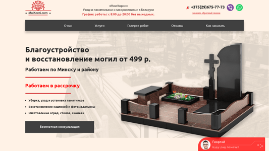 | AI-анализ | --- The website "Мои Корни" (My Roots) offers services for the maintenance and restoration of graves and monuments in Belarus. They provide solutions for neglected burial sites and offer services such as finding, cleaning, and restoration of graves, as well as the creation and installation of borders, tables, and chairs. Their working hours are from 8:00 to 20:00 without weekends, and they can be reached at +375(29)675-77-73 for inquiries or to schedule a callback. The company aims to ensure peace of mind for their clients and has over 100 clients abroad. Their services include the restoration of graves starting from 499 Belarusian rubles, cleaning and maintenance of graves for 60 rubles, restoration of inscriptions and photo medallions |