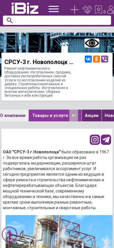 | AI-анализ | This website is a business based in Novopolotsk, Belarus, located at Promyshlennaya 17 in the industrial area. The company, SRSU-3 g. Novopolotsk OAO, offers services in the repair of oil and chemical equipment. They also manufacture, sell, and deliver ready-mixed concrete. The company provides woodworking services and offers construction, montage, and special project services. They produce and install metal, prefabricated concrete, and asphalt structures. The company was established in 1967 and has since undergone modernization and expansion. It now employs a large workforce and offers a wide range of services in the field of repair and construction of oil and chemical facilities. The company has a powerful technical base, modern equipment, and technology, enabling it to execute various repair, installation, construction, and welding projects |