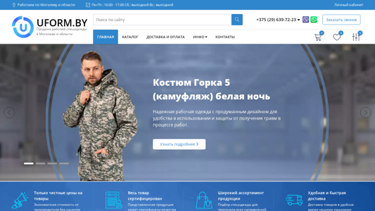 | AI-анализ | language: ru The portal Uform.by is an e-commerce website for purchasing workwear and safety clothing in Mogilev, Belarus. The company offers both wholesale and retail sales of workwear and safety footwear at manufacturer's prices with a flexible discount system. The website features a catalog with various categories such as summer and winter workwear, protective clothing, headgear, and safety footwear. Contact information includes phone numbers and a personal cabinet for customers on Uform.by. The website operates from Monday to Friday, 10:00 - 17:00, with weekends being closed. |