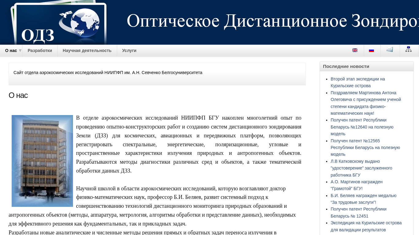 This online resource, titled "О нас | Optical Remote Sensing" (About Us | Optical Remote Sensing) in Belarusian, is a website belonging to the Aerospace Research Department of the National Institute for Instrument Engineering (НИИПФП) at Belarusian State University (БГУ). The site focuses on optical remote sensing research and development, providing information about the team, history, partners, and contacts, as well as their services and research areas. They specialize in creating systems for earth observation using various platforms, including space, aviation, and portable ones, capable of detecting spectral, energetic, polarization, angular, and spatial characteristics of natural and anthropogenic objects. The department has a long-standing experience in optical remote sensing research and development, employing a systematic approach to improving monitoring technologies for natural and man-made structures. They have developed