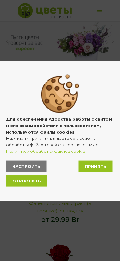 SEO-описание | Купить цветы в Минске и РБ, а также букеты и комнатные растения в горшке по доступным ценам в "Евроопт". В наличии разнообразный и регулярно обновляемый ассортимент цветов. |