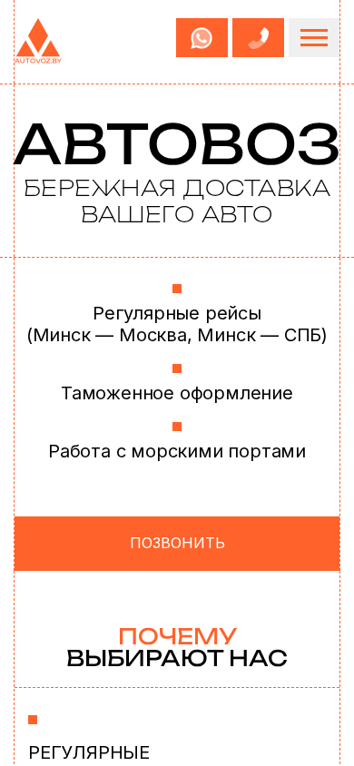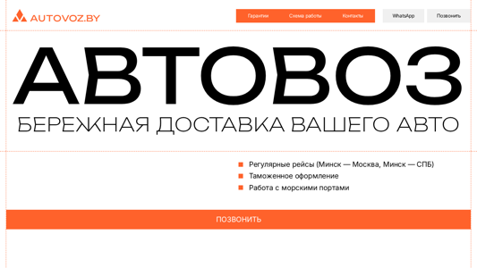 | AI-анализ | This website is titled "Автовоз" and focuses on providing "Бережная доставка вашего авто" (secure delivery of your car). Keywords include "Автовоз," "Бережная доставка вашего авто," and "авто." The top words are "минск," "авто," "вашего," "рейсы," "москва," "перевозки," "гарантии," "схема," "работы," "позвонить," "регулярные," "таможенное," "оформление," "под," "ключ," "все," "автовоз," "контакты," and "whatsapp." The domain is autovoz.by. The website offers "Регулярные рейсы" (regular routes) |