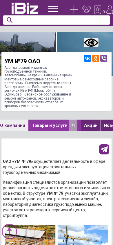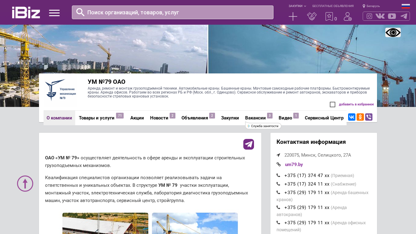 | Название / Заголовок | УМ №79 ОАО - Аренда, ремонт и монтаж грузоподъемной техники. Автомобильные краны. Башенные краны. Мачтовые самоходные рабочие платформы. Быстромонтируемые краны. Аренда офисов. Работаем во всех регионах РБ и РФ (Моск. обл., г. Одинцово). Сервисное обслуживание и ремонт автокранов, экскаваторов и приборов безопасности стреловых крановых установок.. 220075, Минск, , Селицкого, 27А |