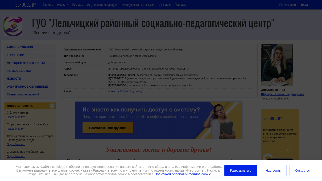 | AI-анализ | --- This website is for the "Lelchitsky District Social and Pedagogical Centre" in Belarus. It uses cookies for website functionality and data collection and analysis. Visitors can allow or manage cookie settings. The site contains information about the centre's work, including news and support services for children and education. The design is plain with black text on a white background and no images. There is a link to a cookie policy and a list of cookies used. |