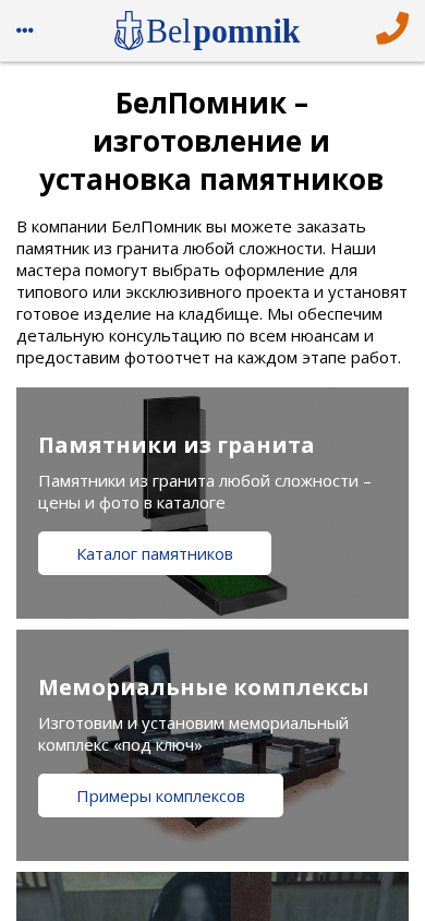 | SEO-описание | Изготовление памятников – мастерская БелПомник. ✓ Более 100 моделей памятников в каталоге. Установка памятников и оформление могил в Минске и по всей РБ. |