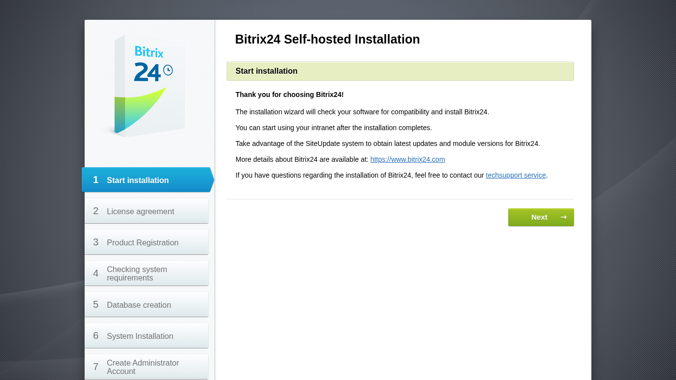 | AI-анализ | language: en The web project "Bitrix24 Self-hosted Installation" provides instructions for installing the Bitrix24 intranet system on a self-hosted environment. The project requires JavaScript support and guides users through the installation process, which includes checking system requirements, creating a database, and selecting a solution and module to install. Users can obtain updates and latest versions through the SiteUpdate system once the installation is complete. The project is available in English on the domain gline.by. |