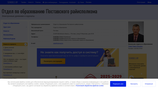 | AI-анализ | ---  The web project "Postavy Rural Education Office, Поставского райисполкома" is an educational website located at postavyroo.schools.by. The title of the site is "Отдел по образованию Поставского райисполкома". The site uses cookies for site functionality and data analysis. Users can allow or manage cookies through the site's cookie policy. The site's color scheme is gray and images are turned off. The site contains information about the education office and its offerings, including a link to "подробнее" (more details) and a phone number "02155". Keywords associated with the site include "образования" (education), "файлов" (files), "сайта" (site), and "поставского" (Postavy). The site's top words include "cookie", " |