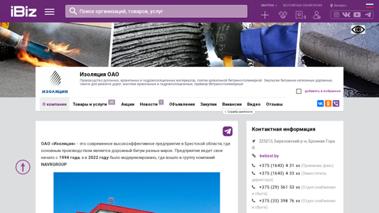 | AI-анализ | This website is for OAO (Open Joint Stock Company) Isolation, a company based in Belarus producing roll materials, roofing and hydro-isolation materials, including bitumen-polymer tiles. They also offer asphalt emulsion road repair mixtures, bitumen roofing and hydro-isolation mastics, and bitumen-polymer primer. The website provides a scheme for visiting the company, contact information and is located in Bronnaya Gora, with postal code 225213. |