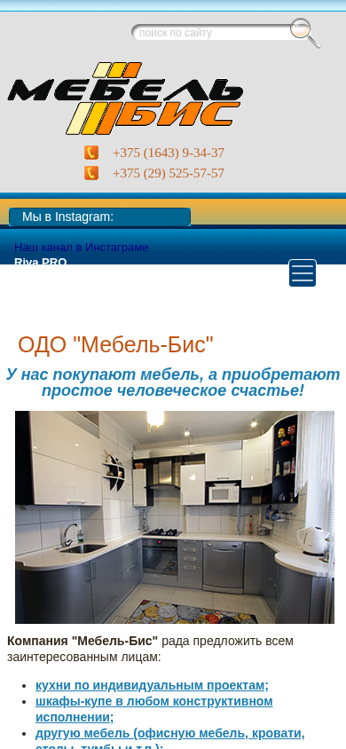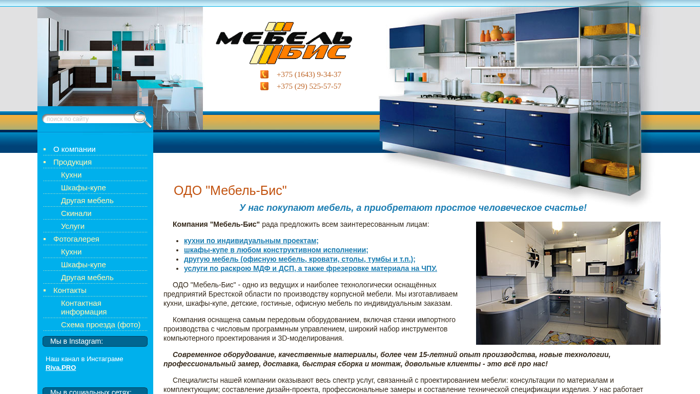 | SEO-описание | ОДО «Мебель-Бис». Производство корпусной мебели по индивидуальным размерам. Кухни, шкафы-купе, тумбы, столы и другая мебель в Берёзе и Брестской области. Услуги по распилу ДСП и МДФ, 3D-обработка и фрезеровка на ЧПУ материала заказчика. |