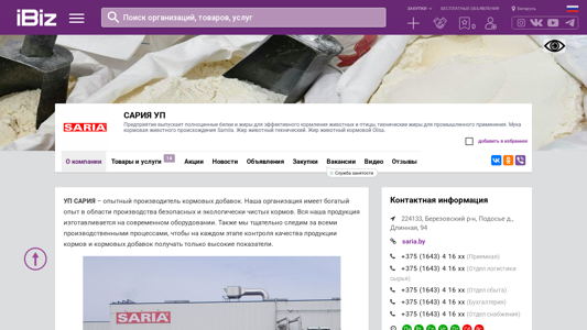 | AI-анализ | The portal saria.ibiz.by is a Belarusian business website focused on producing and selling animal feed and technical fats. The company offers full-nutrient animal and bird feed, as well as technical fats for industrial applications. Their product line includes Samila, a livestock-derived feed ingredient, and two types of animal fat: Olisa, a livestock-derived technical fat, and a livestock-derived feed fat. The company's address is 224133, , Подосье д., Длинная, 94. There are sections for company information, products and services, and contact details, including phone numbers, on the website. |