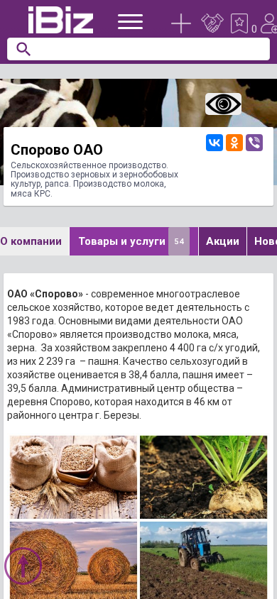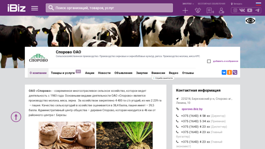 | AI-анализ | --- The web project "Sporovo OAO - Agricultural Production. Production of cereals and legumes, rapeseed. Production of milk, meat of cattle.." is a Belarusian agricultural company based in the village of Sporovo, Lenina 10, with a total area of 4,400 hectares for agricultural production, of which 2,239 hectares are arable land. The quality of the agricultural land is rated at 38.4 and 39.5 for the land itself. The company specializes in the production of milk, meat, and cereals. It has two brigades for crop production, two dairy farms, three meat farms, a repair shop, construction brigade, electricity service, and a vehicle maintenance department. The quality of agricultural products is confirmed by positive partner feedback and awards, diplomas, and prizes in |