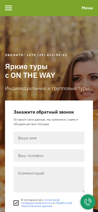 | AI-анализ | This online resource, titled "Яркие путешествия с ONTHEWAY" (Bright Journeys with ONTHEWAY), offers various types of travel arrangements, including corporate and family trips. Keywords associated with the website include "travels," "family travels," and "hikes." The top words on the page are "спасибо" (thank you, used 20 times), "ontheway" (9 times), "семь" (seven), "андрей" (Andrey, seven times), and "путешествиях" (in the plural, seven times). The website includes a menu, contact information, and options to request a callback or leave one's details for further communication. The website also features testimonials from satisfied clients. |