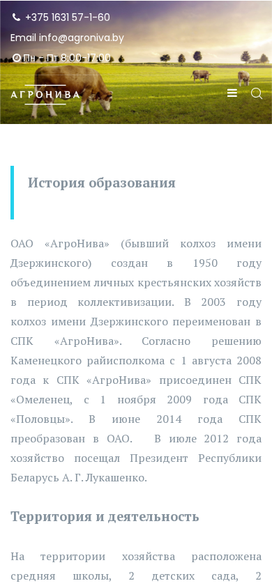 | AI-анализ | The web project "Open Joint Stock Company 'Agroniva'" is a Belarusian agricultural enterprise with a long history, established in 1950 as a collective farm during the collectivization period. The farm was renamed as a Farming Production Cooperative (SPK) 'Agroniva' in 2003, and later, in 2008, it was merged with SPK 'Omeleneц' and SPK 'Polovcy'. In 2014, the SPK was transformed into an Open Joint Stock Company (OJSC). The enterprise occupies a large territory with agricultural land of 8,174 hectares, including 6,000 hectares of arable land. The average fertility index for the agricultural land is 32.3, and 34.3 for arable land |