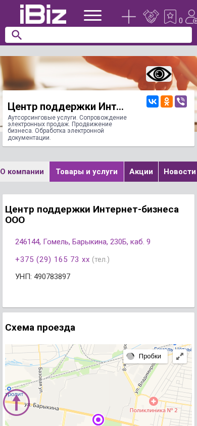 | AI-анализ | language: ru The website is for Centr Podderzhki Internet-Biznesa OOO, an organization offering outsourcing services for e-business support, including sales management, business promotion, and electronic document processing. The website contains sections for company information, products and services, news, and contact details. The address and contact information, including phone number and location, are provided. The company's UNP number is 490783897. The website is in Russian and the domain is e-center.ibiz.by. |