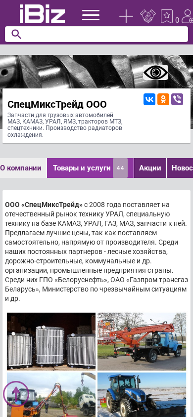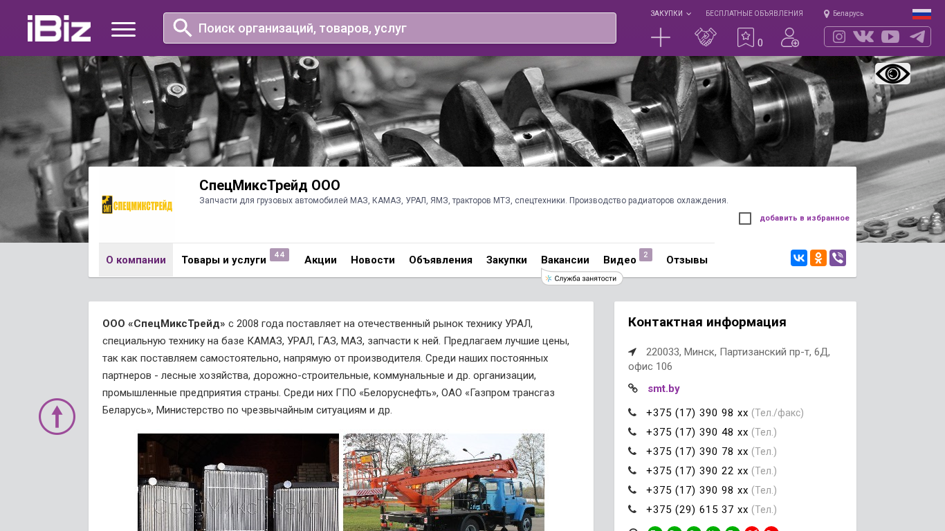 Название / ЗаголовокСпецМиксТрейд ООО - Запчасти для грузовых автомобилей МАЗ, КАМАЗ, УРАЛ, ЯМЗ, тракторов МТЗ, спецтехники. Производство радиаторов охлаждения.. 220033, Минск, , Партизанский пр-т, 6Д, офис 106