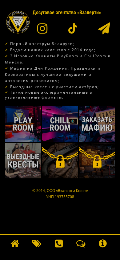 | AI-анализ | The web project "Взаперти (Vzaperti)" is a Belarusian agency specializing in escape rooms and themed parties, particularly those based on the mafia theme. The business has been operating since 2014 and is located in Minsk, serving both the city and its surrounding areas. They offer in-house experiences in two rooms, PlayRoom and ChillRoom, as well as mafia-themed activities for birthdays, corporate events, and celebrations. The agency prides itself on high-quality productions, featuring professional actors and unique decorations. Additionally, they offer outdoor quests and experimental formats. The website includes a menu, FAQ, and contact information. |