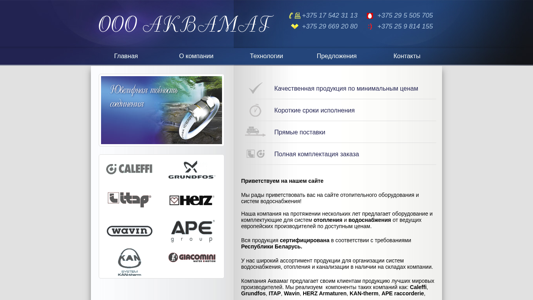 | AI-анализ | The portal Akvamag is a Belarusian website dedicated to offering heating and water supply equipment from leading European manufacturers. The company has been providing such products and components for several years at affordable prices, with all items certified according to Belarusian regulations. Akvamag's inventory includes a wide range of products for organizing heating, water supply, and sewage systems. The offered items include gas and solid fuel heating appliances, boilers, water heaters, filters, and sanitary ware, among others. Contact information for the company is provided, including phone numbers and email address. The website was created by WebCenter.by. |