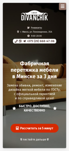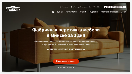 | AI-анализ | This online resource, titled "Профессиональная перетяжка мебели в Минске | DIVANCHIK.by - реставрация и обновление мягкой мебели," offers professional reupholstering of furniture in Minsk, Belarus, at affordable prices. Services include restoration of sofas, chairs, and stools with a guarantee of up to 18 months. Free on-site measurement and delivery are provided. Keywords associated with the site include "перетяжка мебели минск," or "reupholstering furniture in Minsk," as well as "реставрация диванов," or "restoration of sofas," and "обновление кресел," or "reupholstering chairs." The site offers both standard and comprehensive reupholstering services, including the |