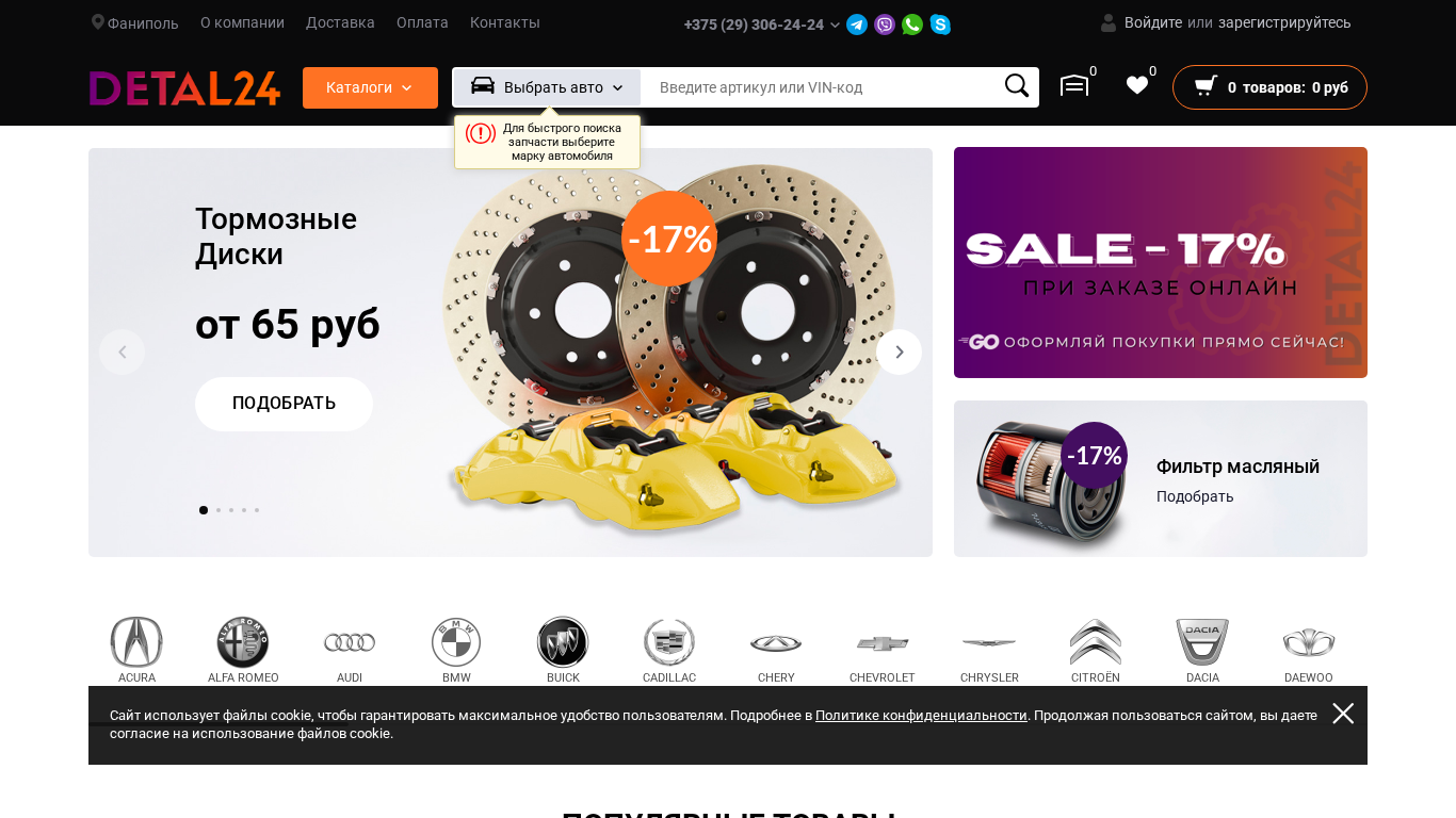 | SEO-описание | В каталоге интернет-магазина автозапчастей detal24.by представлено более 1 000 000 позиций для любых автомобилей. Удобный подбор и возможность оформить заказ на сайте 24 часа в сутки. Скидки до -17% на весь ассортимент при покупке online! |