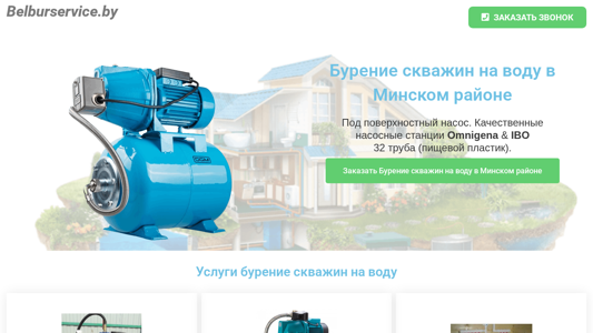 | AI-анализ | The website Belburservice.by offers water well drilling services in the Minsk region. The company has experience of 10 years and provides drilling under the surface water pump. The drilling price starts from 750 rubles and includes the installation of a 32mm pipe and filter. The website also mentions the availability of quality submersible pumps Omnigena & IBO 32. The drilling process includes the fitting, reverse valve, and water pump crane, and the cost depends on the foundation depth and house material. The website allows users to leave a request for a callback. The reviews section includes testimonials from satisfied clients who praise the professionalism and quality of the services. One client, Vasily Dzerzhinsky, expresses his appreciation for the clean and tasteful water from his well, while Anatoly Ivanovich from Novopolotsk shares his |