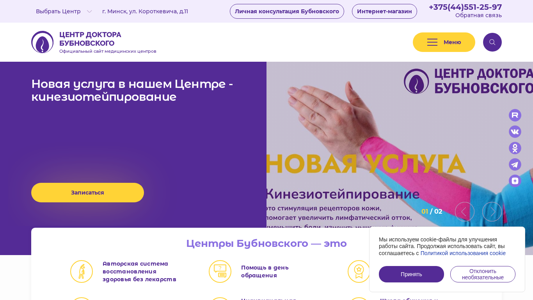 | AI-анализ | This online resource is the official website for the Doctor BuBnovsky Rehabilitation Center in Minsk, Belarus. The Center offers rehabilitation services for the musculoskeletal system in accordance with international standards. The website provides information about the center, its location at ul. Korotkevich, d.11 in Minsk, and contact details including a phone number +375(44)551-25-97 for consultation and inquiries. The menu includes sections on author exercises, about the center, pricing, services offered, testimonials, and promotions. The center also has a presence on social media. The site focuses on providing individualized programs of kinesiotherapy, and offers a school for training and educating medical personnel. The rehabilitation process includes 12 sessions, gymnastics, cryotherapy, sauna therapy |