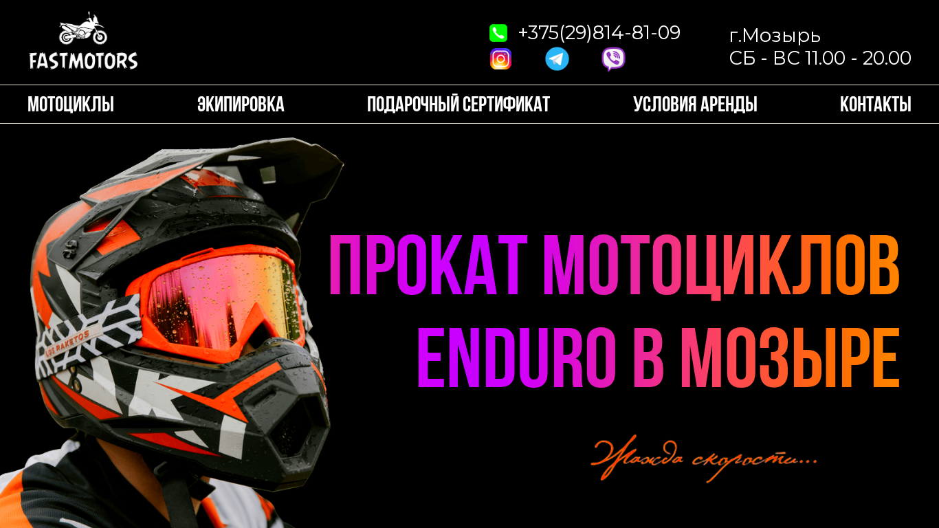 | AI-анализ | --- The web project Fastmotors.by is an online platform for motorcycle rentals in the city of Мозырь, Belarus. It offers Enduro motorcycles for rent, specifically the Progasi Palma 300 and 250 models. The website provides detailed information on the motorcycles' features, such as their engine size, horsepower, and cost per hour for rental. Visitors can also find information on available equipment, including safety gear and protective clothing, which is provided free of charge with motorcycle rental. The website includes a section for contact information and rental conditions, which detail the age, weight, and height requirements for renters, as well as the rules and restrictions for motorcycle usage. Additionally, the site offers a gift certificate as a purchasable item for those looking to give the experience of motorcycle riding as a gift. |