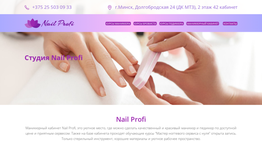| AI-анализ | This website is for Nail Profi, a cozy salon offering high-quality and attractive manicure and pedicure services at affordable prices and friendly service. The salon also hosts training courses "Master Nail Service from Scratch" with open enrollment. Only sterilized instruments, good materials, and a comfortable working environment are used. Manicure courses for groups of up to three people last three days, while pedicure and brow shaping courses last one day each. All consumable materials and tools are included in the course fees. Manicure and pedicure services feature only sterilized instruments, good materials, and a comfortable working environment. The studio, Nail Profi, offers combined manicure services, as well as design options involving geometry. Social media groups are available for staying informed about the latest news and exclusive discounts. Contact information for the Minsk salon located at M |
