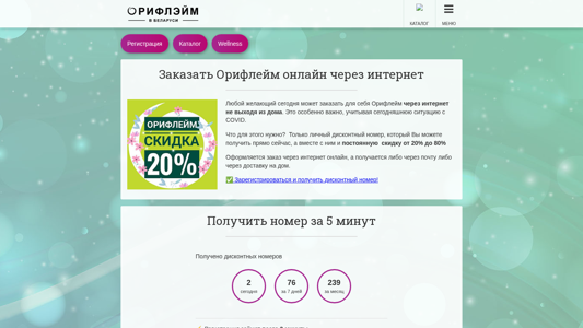 | AI-анализ | The web project "Order Oriflamme online with delivery in Belarus - Oriflamme Belarus" offers customers the opportunity to order Oriflamme cosmetics online with discounts ranging from 20% to 80% and delivery to their doorstep in Belarus. The registration process is quick and easy, taking only three minutes, and requires only a personal discount number which can be obtained immediately upon registration. Orders can be placed online and delivered either through the mail or at home. The registration process is free for orders over 30 rubles, and costs 4.99 rubles for smaller orders. Customers can browse the online catalog, which includes popular items such as water, lotion, cream, and Oriflamme for delivery. The service is available for customers in all cities of Belarus. |