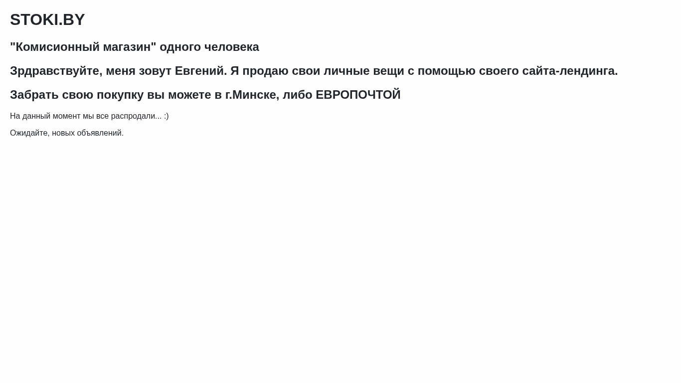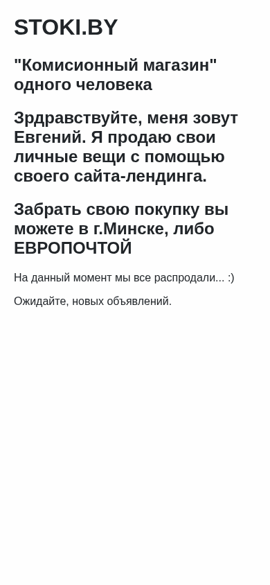| AI-анализ | The web project Stoki.by operates as a commission marketplace run by one individual named Evgeny. The site introduces itself as a 'Комиссионный магазин' where Evgeny sells his personal belongings through his website. Interested buyers can pick up their purchases in Minsk or via European postal service. Currently, all items have been sold. Buyers are advised to wait for new listings in the future. |