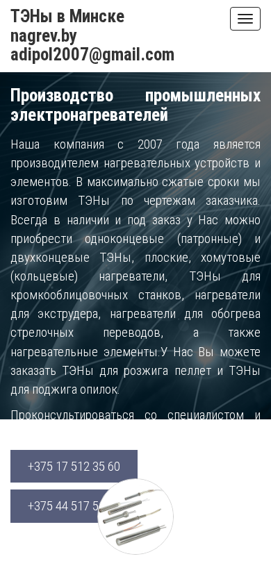 | Название / Заголовок | ТЭНЫ в Минске. Производство нагревательных устройств и элементов.Одноконцевые, двухконцевые патронные ТЭНы, нагреватели для экструдера, стрелочные нагреватели. ТЭНЫ для кромкооблицовочных станков. ТЭНЫ для розжига пеллет, тэны для поджига опилок.Термостойкие провода в наличии. Проволока нихром X20H80. |