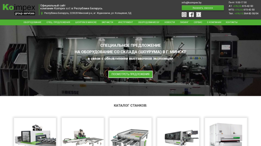 | SEO-описание | Официальный представитель компании Koimpex в Беларуси. Продажа станков для деревообработки. Гарантийное и после гарантийное обслуживание. |