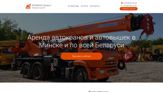 | AI-анализ | This website is for the rental company ЮРМИАЛ-Инвест, which offers reliable partnership for both private and corporate clients in Belarus. The company provides a well-equipped fleet and excellent service for renting cranes and lifting platforms in Minsk and throughout Belarus. Services include the rental of cranes with varying capacities and heights, ranging from 22 to 62 meters, at prices from 360 to 2000 Belarusian rubles per day. The rental of cranes with capacities of 25, 35, 40, 50, 60, 70, 80, 90, 100, 160 tonnes starts at 600 Belarusian rubles per shift. All equipment is in good condition and ready to work at any time |