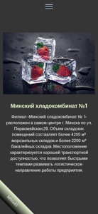 The website is for Mhlad1 Minsk Chladocombinat No.1, a refrigerated storage facility located in the center of Minsk, Belarus. The website offers rental services for refrigerated warehouses, offices, and refrigerated chambers. The facility has a capacity of over 4200 m³ of refrigerated storage and over 2200 m³ of dry storage. Its central location provides easy transportation access, allowing for efficient logistics operations. The company began as a Soviet meat and dairy processing plant in 1951, but now offers modern, high-tech services for the storage and logistics of various types of goods, including food and non-food items. The company's services include responsible storage of goods, and it is the largest operator in Minsk for storing mixed-type products, particularly in the frozen state, with the ability to shock-free