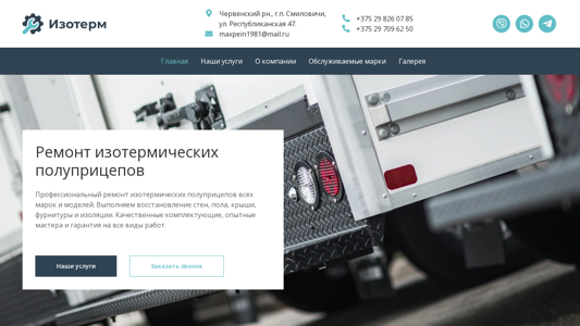 | AI-анализ | This website is dedicated to the repair of isothermic semi-trailers in Minsk, Belarus. The company offers professional services for the diagnosis, restoration of the body, insulation, doors, and furniture. They use quality components and experienced technicians, ensuring a reliable repair with a guarantee. The website also features a gallery of completed projects and contact information for the company, including phone numbers, Viber, WhatsApp, and Telegram. The company has been in business for many years and specializes in the repair of isothermic semi-trailers, addressing issues with insulation, body damage, and door mechanisms. They guarantee the durability and long-term service of the repaired equipment. The website includes information about their services, including the repair and replacement of sandwich panels, floor repair, bodywork, and roof repair. The company serves various isothermic semi-trailer brands and offers |