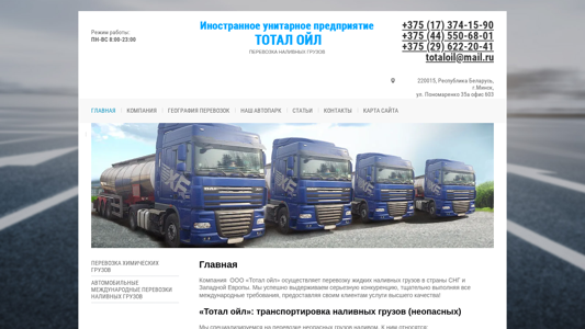 | AI-анализ | The portal Totaloil.by is a company specializing in the international transportation of liquid bulk goods in tank trucks to countries in the European Union (EU) and the Commonwealth of Independent States (CIS). The company handles the transport of both hazardous and non-hazardous liquids, including food products such as oils, fats (both plant-based and animal), milk, and starch, as well as various chemicals that are not easily flammable, explosive, toxic, corrosive, or radioactive. The company uses powerful and efficient daily trucks from DAF XF 105.460 and is a member of the Association of International Road Transport Carriers (BAMAP). All transportation vehicles are insured with cargo insurance policies. Non-hazardous goods are transported in IMO2 tankers, which are available in the company's fleet. These |