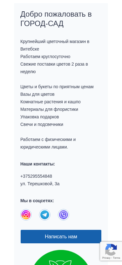 | AI-анализ | The portal 'Gorod-Sad' is the largest flower shop in Vitebsk. It operates 24/7 with fresh flower deliveries twice a week. The shop offers flowers, bouquets, vases, potted plants, materials for floristry, and packaging for gifts, as well as candles and lanterns. The business works with both physical and legal entities. |