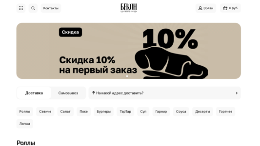 | AI-анализ | --- This website is for the Belarusian restaurant "БЕКОН Гродно" (Bekon Hrodno) selling various dishes, including rolls, sushi, salads, poke bowls, burgers, tatar, soups, and desserts. The most frequently occurring keywords are "руб" (rubles), "соусом" (sauce), "бургер" (burger), and "ролл" (roll). The menu includes rolls such as one with tuna, truffle-oyster sauce, and another with eel, smoked pepper, and spicy cheese. Burgers include options like a triple burger, chicken grill, and a burger with raspberry sauce. Sushi dishes like seviche and salmon are also offered. The website includes sections for customer reviews, promotions, contacts, and login. |