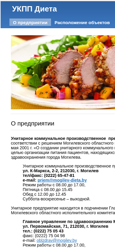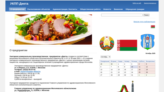 | AI-анализ | The web project "УКПП Диета" is a communal production enterprise specializing in the organization of dietary food for patients undergoing treatment in healthcare institutions in the city of Могилев, Belarus. Established in 2001 by the Moгилевский областной исполнительный комитет, the enterprise operates under the name Унитарное коммунальное производственное предприятие «Диета» and is located at ул. К-Маркса, 2-2, 212030, г. Могилев. The enterprise offers a range of services, including public catering, retail and wholesale trade. It manages seven catering facilities, one café, a mini-market, and 14 buffets. The production of culinary products takes place at the catering facilities, utilizing |