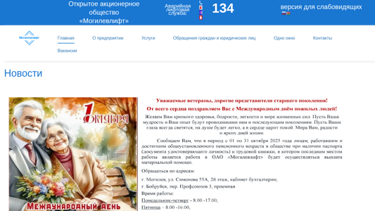 | AI-анализ | The website is of the open joint-stock company 'Mogilevlift', which provides elevator services. The site includes sections for the company's services, contacts, and a graph for the reception schedule of the company's management. The site also offers safety rules for children and adults using elevators, as well as detailed rules for the operation of passenger elevators. The site is available in Belarusian and Russian languages, and requires JavaScript to use its multilingual features. The design features a standard font size and color scheme, with options for black on white, white on black, and various other color combinations. The site includes a section for job vacancies and news, as well as materials on fire safety and preventing extremism and terrorism. The site is operated 24 hours a day and serves over 3,000 elevators, with 55 years of experience in elevator equipment. Services offered include the |