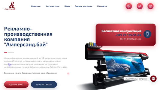 | AI-анализ | This online resource is a professional wide-format printing company, "Амперсанд.бай," located in Minsk, Belarus, using German equipment from Roland and German materials and high-quality inks for wide-format printing. Operational printing within an hour. The company provides professional quality printing for interior decoration, exhibition stands, retail spaces within shopping complexes, and offices of corporations. Clients range from small businesses to large corporations and holdings. The company guarantees preservation of high-resolution images with bright, natural colors and the ability to produce large quantities. Confidentiality of intellectual property is ensured. Services include operational printing within an hour, discounts for orders over 50 meters, and free delivery within the Minsk city limits for orders over 25 meters. Applicable fields include interior decoration, exhibition stands, retail spaces, and offices. The equipment and materials |